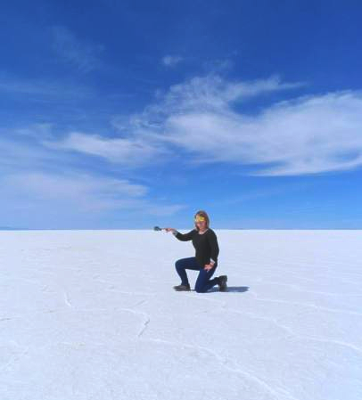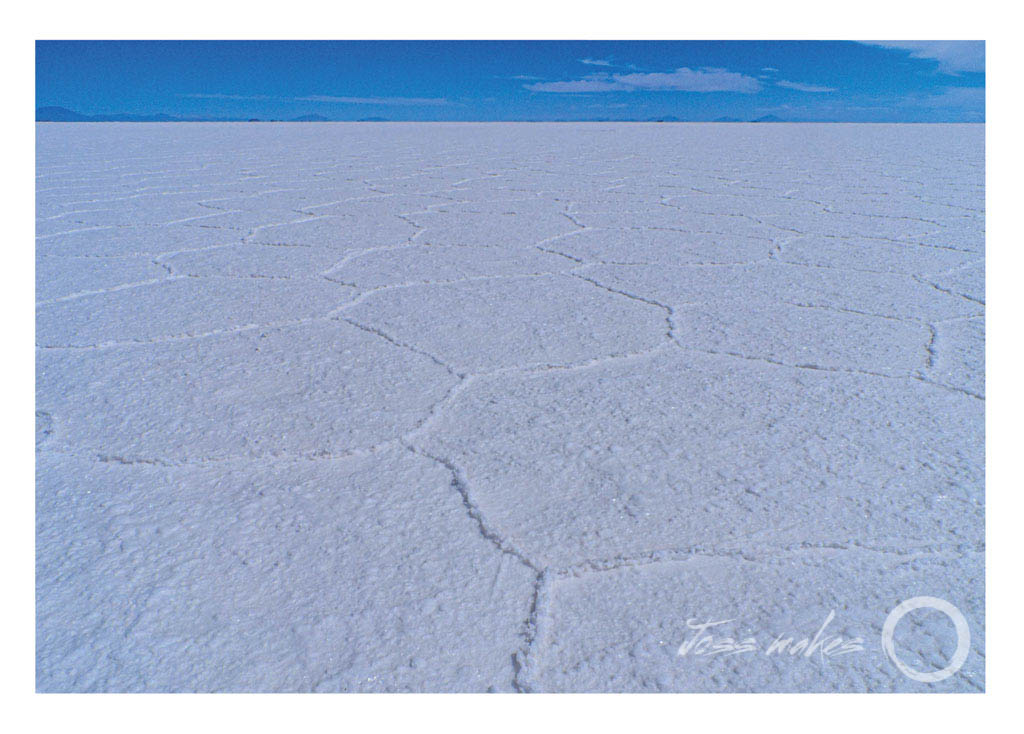 flamingos they are home to. By the third day we had reached the worlds largest salt desert (Salar De Uyuni). This vast expanse of thick salt, where there once was a prehistoric lake and perfect hexagonal shapes form on the crust stretching out to a seemingly endless horizon.