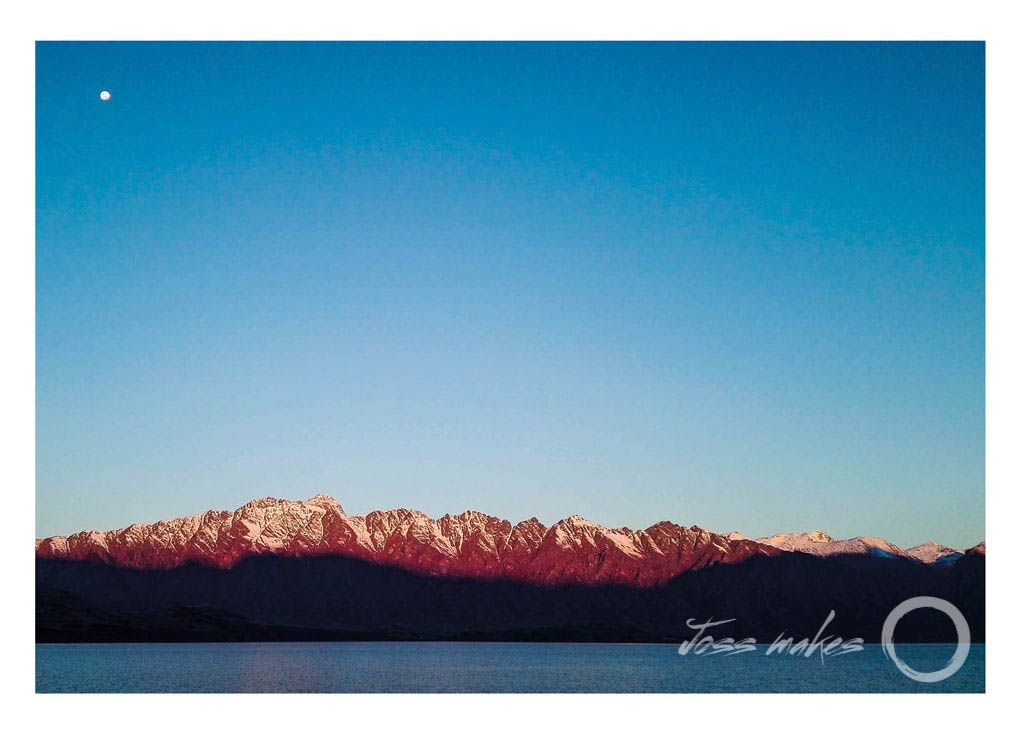 For the summer I worked across Lake Wakatipu at Walter Peak, which involved commuting on the Earnslaw steamboat everyday, whilst during the winter I worked on Coronet Peak, one of the nearby ski hills. This photo shows the Remarkables Mountain range. I captured the sunset on the mountains from the deck of the boat, on way back from work in late summer, just as the first touches of snow covered the peaks. A few weeks after this I was skiing at the Remarkables looking back down over the lake from the summit.