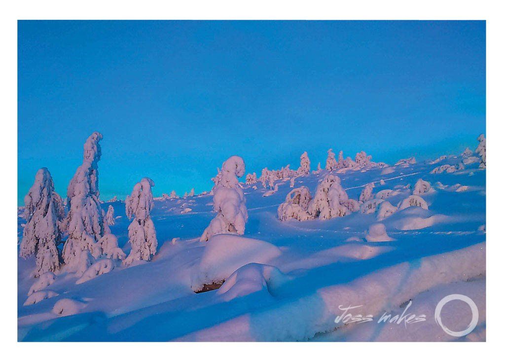 Finland - Arctic Trees Getting to live a five minute walk from the ski hill in Salla meant I could be on the hill everyday, even just for a few runs. I managed to take this photo whilst on the button lift to the top. Capturing the magic snow covered trees in the evening light was well worth the risk of falling off. Salla might be in the middle of nowhere, but having awesome snow conditions, stunning landscapes, cosy cabins, northern lights and welcoming locals; what more do you need?